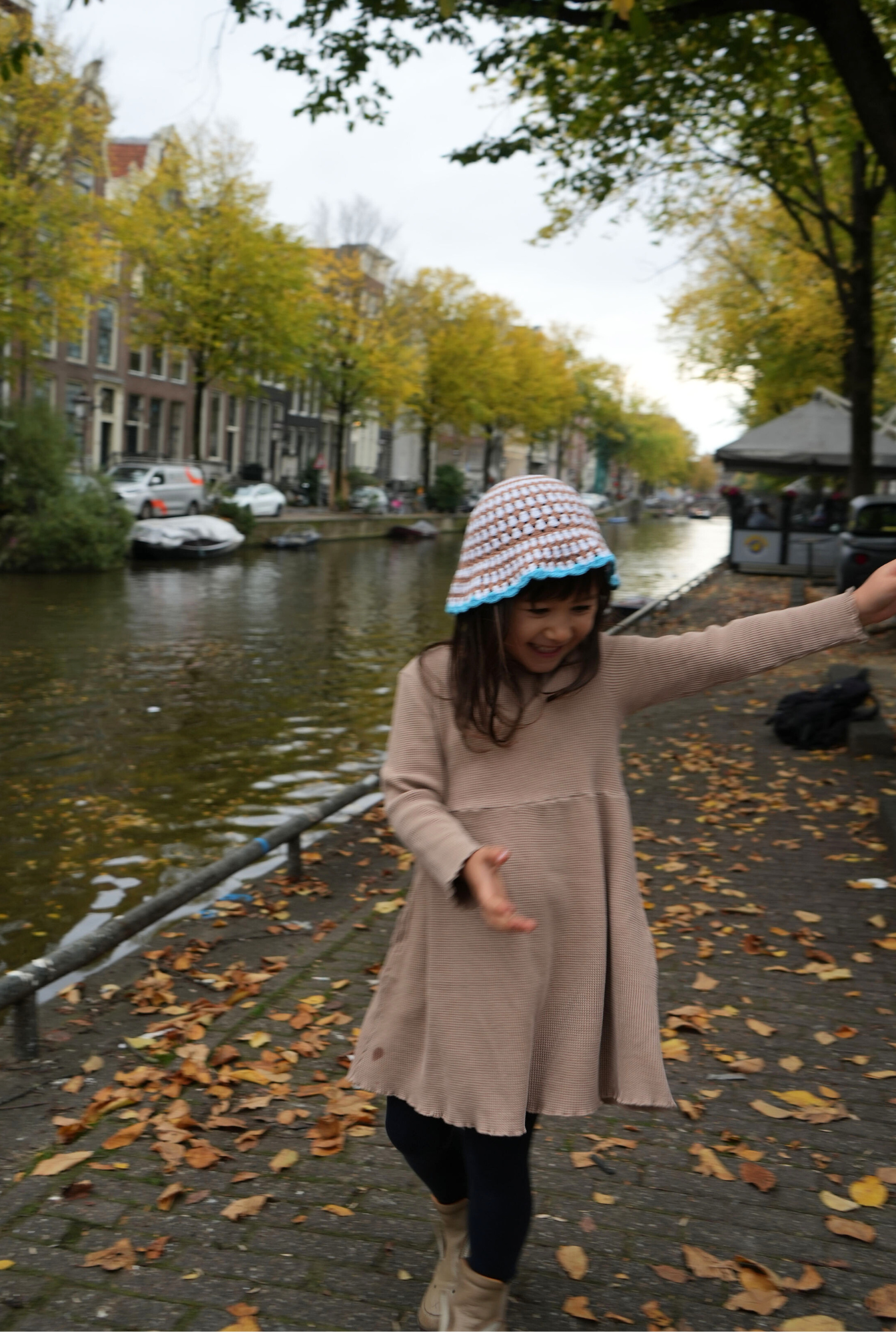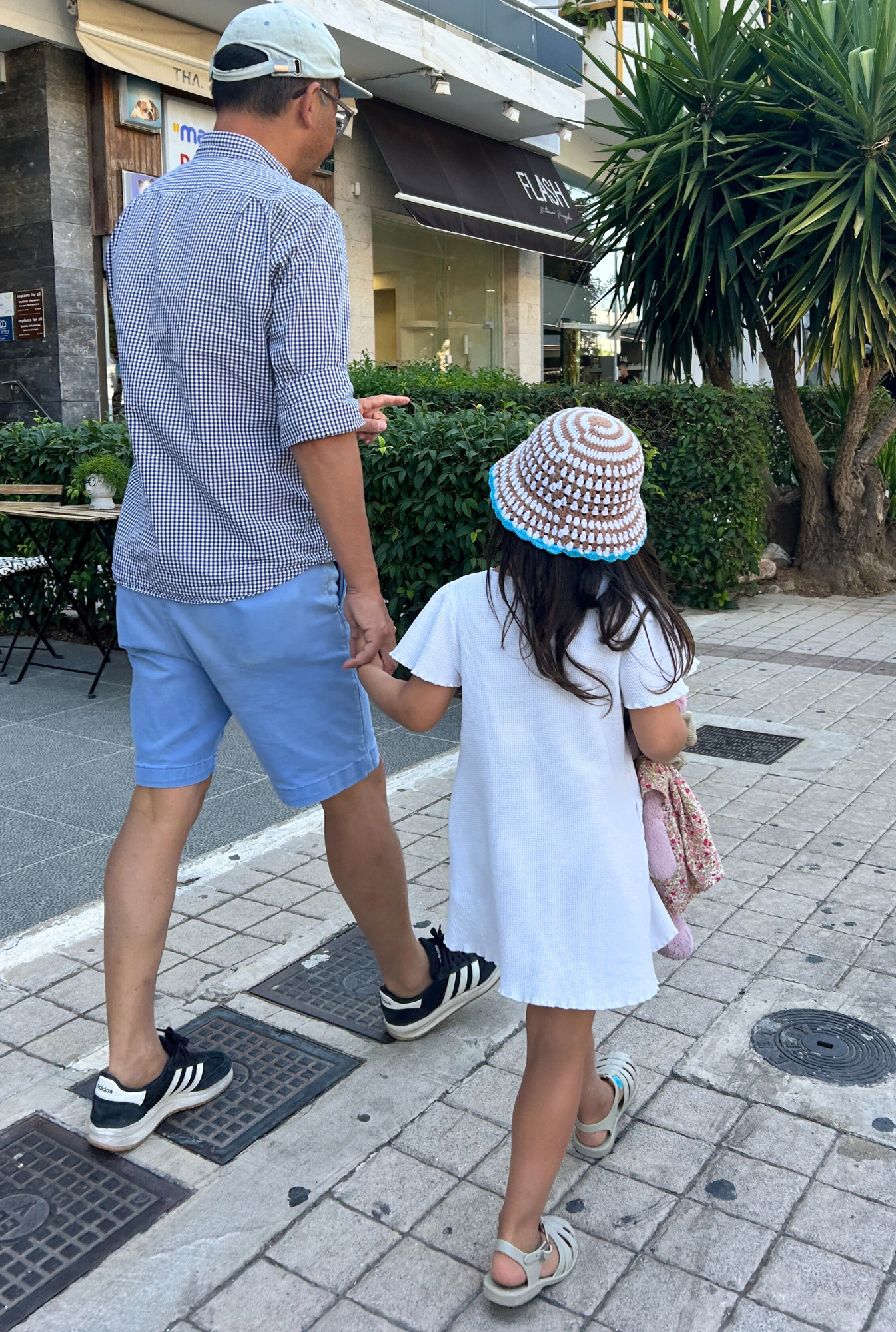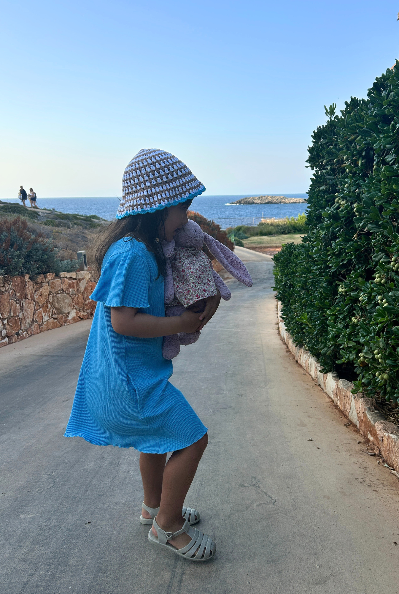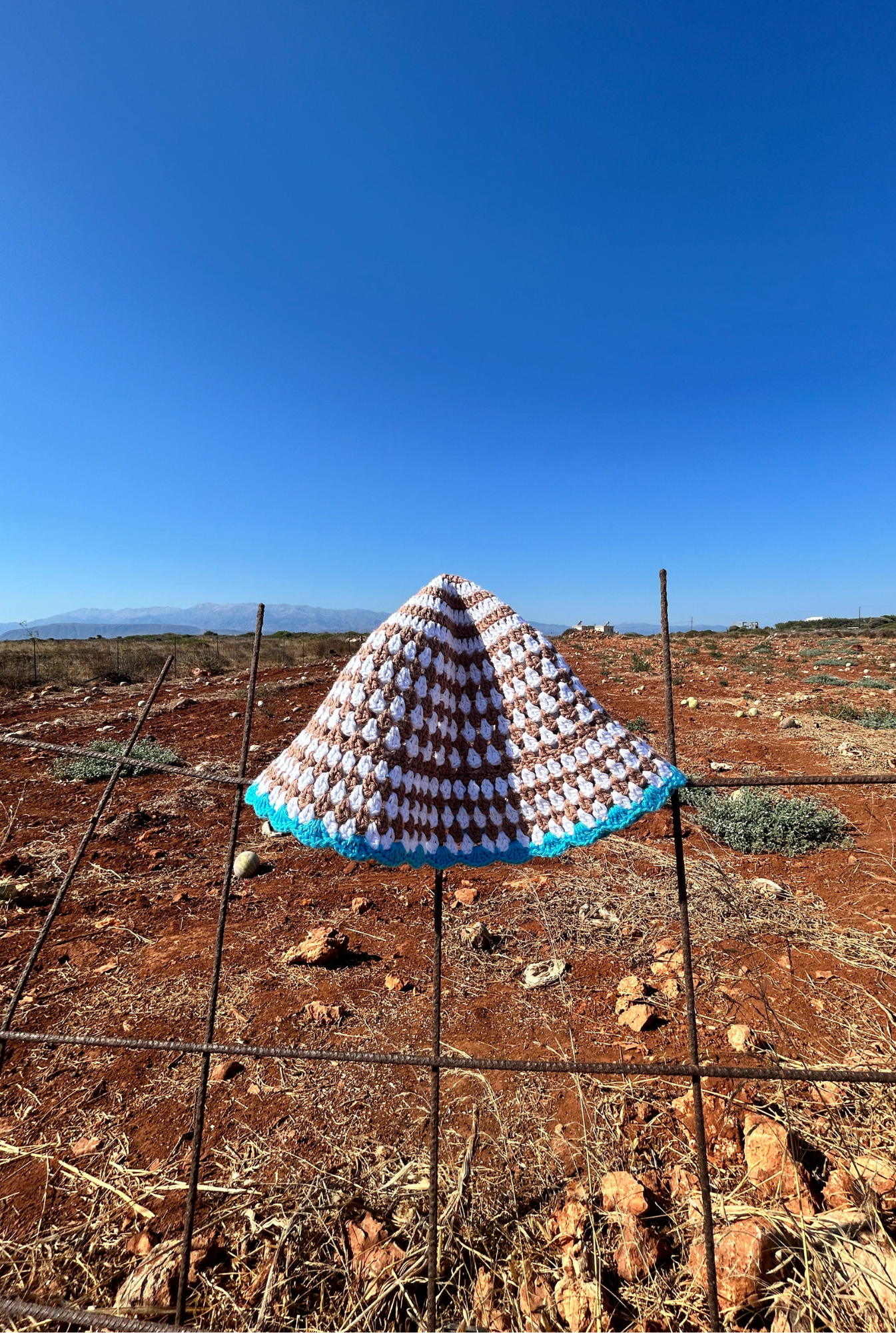 Its playful mix of earthy brown, soft cream, and sky blue edge adds a touch of sunshine to any outfit, making it the prefect companion for everyday adventures from garden wanders to seaside days.